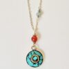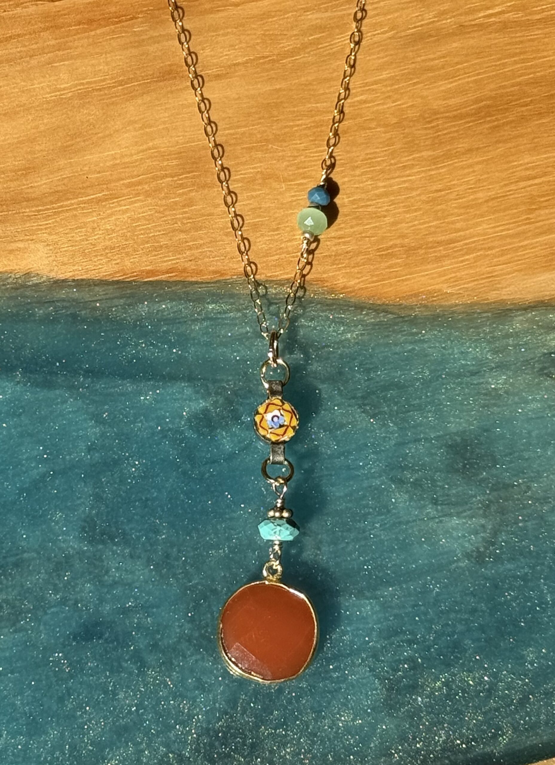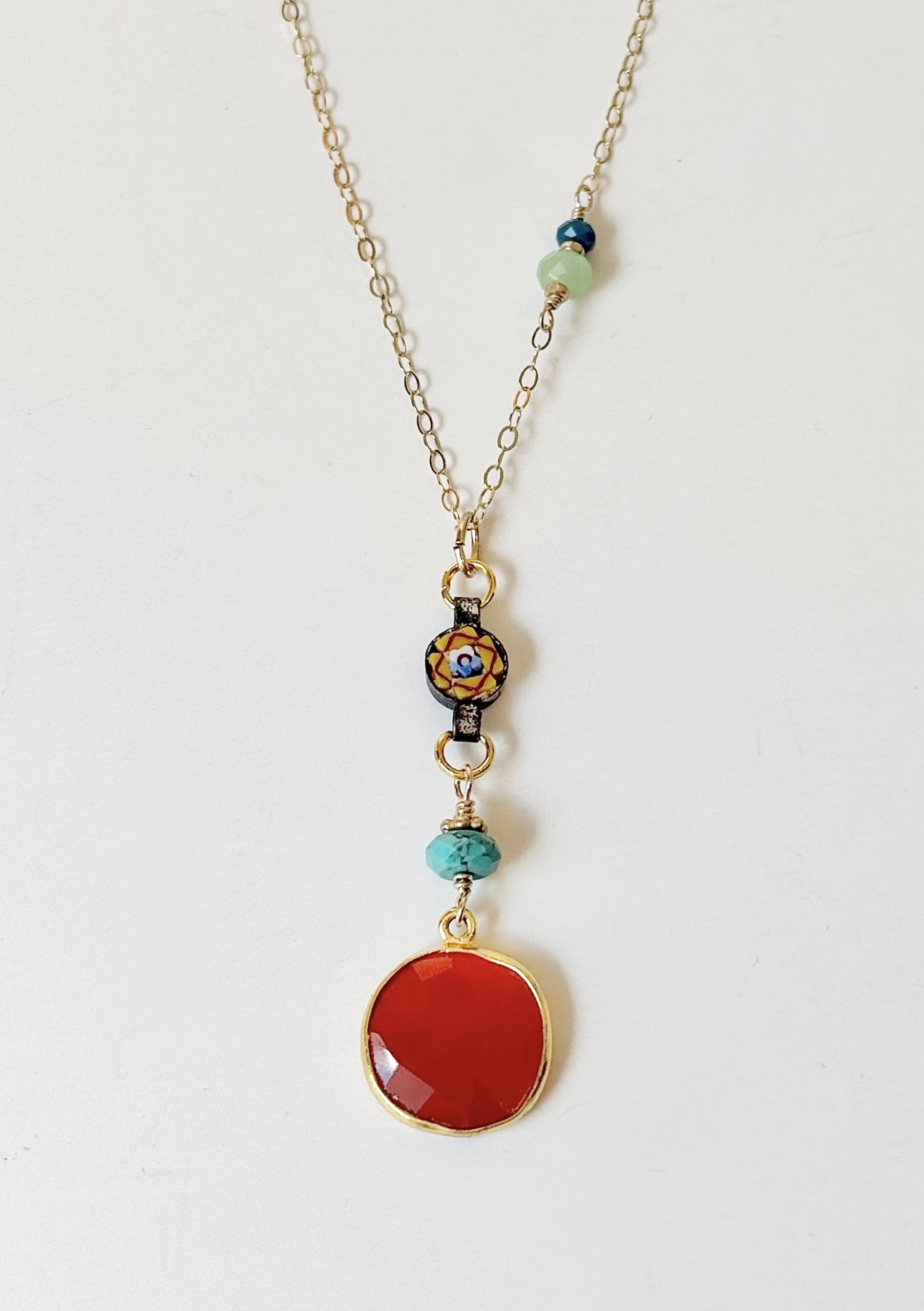 A pretty vintage Italian floral mosaic, faceted Carnelian pendant and turquoise dangles from a 14k gold-filled chain with pretty accent beads. 17 inches long and pendant length almost 2 inches.